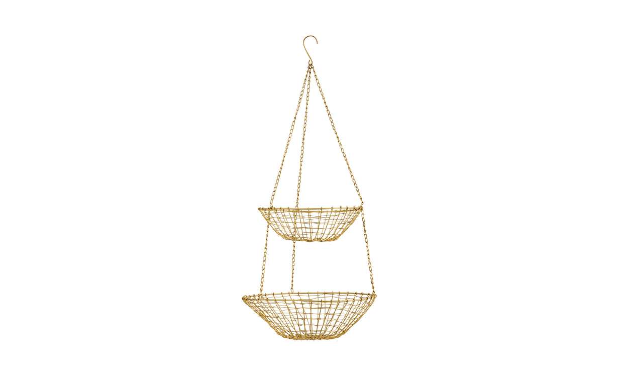En vacker och trevlig hängkorg bestående av två stycken korgar i olika storlekar. Hängkorgen passar att ha i kök där den kan både vara praktisk och dekorativ, fylld med vackra lökar eller varför inte frukt? Den är också användbar i andra sammanhang som till exempel en trevlig detalj bredvid tvättlinan utomhus, där hängkorgen fylls med klädnypor och andra tillbehör.Design & egenskaperTrevlig och funktionell hängkorg som passar både ute och inne.De tre korgarna har vardera en diameter på 21 och 28 cm. Hängkorgen har en totalhöjd på 58 cm.Material & skötselTillverkad av järn/ståltråd.Leverans & förpackningLevereras monterad.Antal förpackningar: 1 stVikt: 0.440 kg