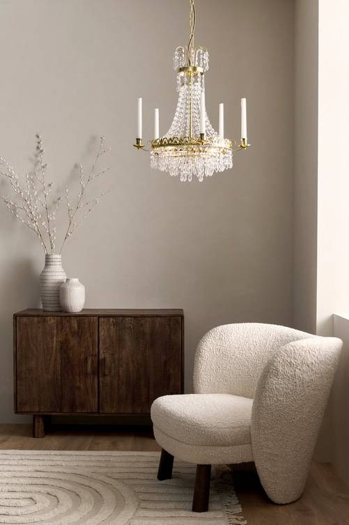 Metallstomme med handslipade prismor i blyfritt glas. Fem ljushållare. Ø 24 mm. Höjd 60 cm. Total Ø 54 cm inkl. ljushållare. Max takavstånd 120 cm. Kedja 50 cm, kan kortas. 3xE14. Max 3x40W. Jordad Takkontakt ingår ej på grund av nytt EU-direktiv. De finns att beställa separat.