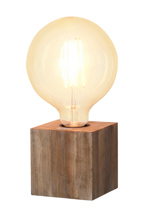 Mått: Bredd 9 cm, djup 9, höjd 9 cm. Kub lampfot i trä. Sladdlängd 1,8 m. 230V. E27 sockel. Ljuskälla ingår ej.