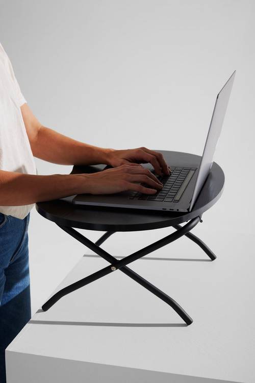 Laptopbord som du placerar på ett annat bord, till exempel ditt köksbord eller köksön, för att få en bra arbetsplats med din bärbara dator. Arbetar du hemma får du praktiskt och enkelt ett ståbord. Den bönformade bordsskivan är av MDF med faner som har fin ådring. Bordet har pulverlackerade metallben med justerbar höjd i tre steg. Det praktiska bordet är enkelt att förvara och blir helt platt när du fäller ihop det. Bordsskiva 62×39 cm. Justerbar höjd i tre lägen, 25 cm, 31 cm, 36,5 cm.