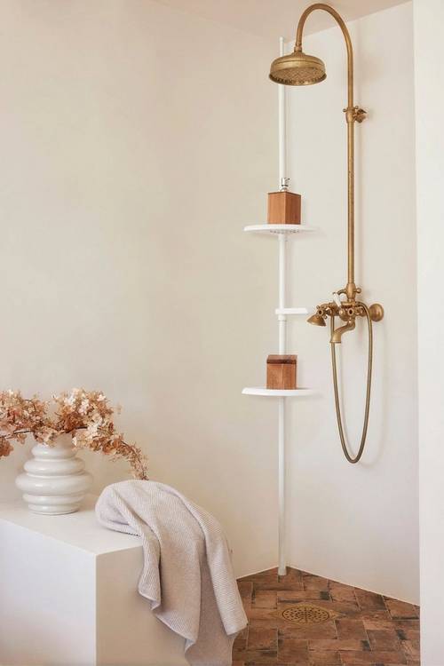 Hörnhylla av metall med teleskopstång och fyra flyttbara hyllor. En praktisk hörnhylla som passar perfekt till badrummet. Placera hyllan mellan badkarskanten och taket, eller från golv till tak. Teleskopstång ger reglerbar höjd och gör den enkel att fästa. Flexibel efter dina önskemål med fyra flyttbara hyllor. Material: Plast. Storlek: Höjd 223-260 cm. Hyllor 32,5×17,5 cm. Hyllmått 19 cm från väggen. Stång ø 2 cm. Tips/råd: LIS hörnhylla passar även i en duschkabin.