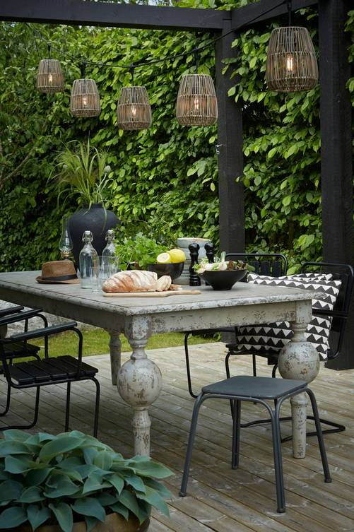 Dekorativ ljusslinga för utomhushusbruk med 5 st E27 lamphållare i naturmaterial. 15 cm från T-koppling ner till skärmring. Material: Gummi och konstrotting. Storlek: Skärm: bredd 18 cm, höjd 20 cm. Slingans längd 6,5 m, 80 cm mellan ljuskällorna. Sockel/lampa: E27, max 15 w glödlampa eller max 5 w lågenergilampa. Ljuskälla medföljer ej.