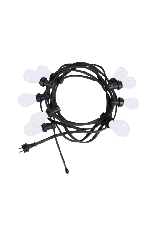 Svart Ljusslinga i IP44, som gör att den kan användas för utomhusbruk. 7,2m, 1,5m till första ljuskällan, sedan är det 0,5m mellan varje. glödlampor med opalglas som ger ett lite vitare sken, 10st lamphållare. E27, max 10W. 10st ljuskällor ingår. E27, 1W, 60lm, 2700K, 20000H, Ra80, A+.
