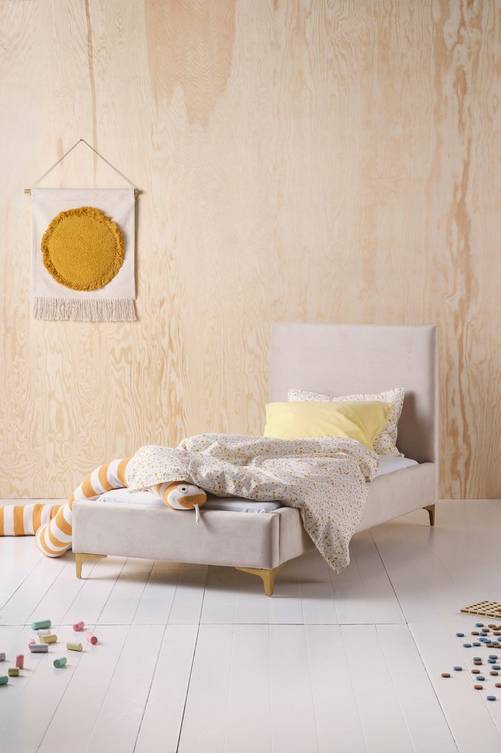 Barnsäng med stoppad gavel klädd i sammet och stilrena mässingben. En perfekt andra säng efter det att barnet har vuxit ur spjälsängen. Används med madrass i storleken 70×160 cm. Madrass ingår ej. Viss montering krävs. Monteringsanvisning medföljer. Material: 100% polyester, trästomme och skumfyllning. Storlek: Bredd 101 cm, längd 175 cm, höjd 89 cm. Skötselråd: Torkas med fuktig trasa. Tips/råd: Förutom bekvämt stöd för ryggen får du ett mjukare intryck med en stoppad sängram.