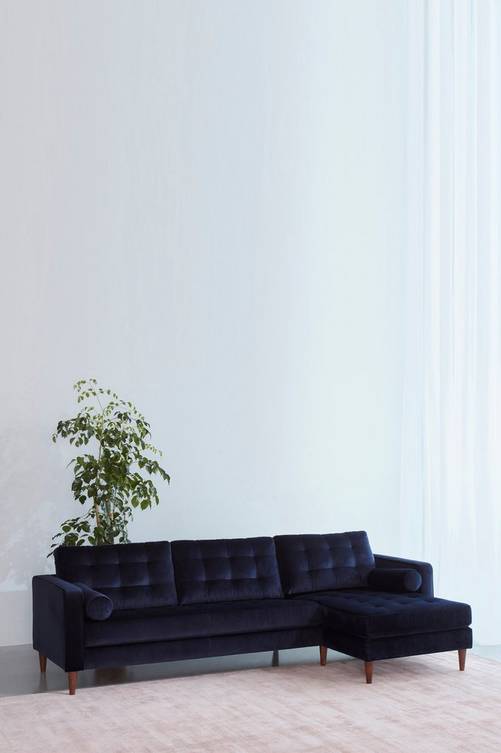 LOULE 3-sits soffa är en stilfull sammetssoffa med monterbar divan på höger eller vänster sida. Hela soffan utstrålar lyx och stil. LOULE 3-sits soffa har ett slitstarkt sammetstyg av polyester och benen är i trä. Fina detaljer i ryggpartiet och en stabil stomme av furuträ och plywood med god sittkomfort tack vare sin fantastiska uppbyggnad av kallskum, zickzackfjädring, resårband samt skön polyesterstoppning. De cylinderformade kuddarna skänker en lyxig känsla vart den än står. Storlek: Höjd 81 cm, bredd 263 cm, djup 81,5 cm, sitthöjd 43 cm. Divan: bredd 80 cm, djup 139,5 cm. Frihöjd under möbel: 15 cm. Skötselråd: Dammsugning. Formgivare: Jotex Design Studio.