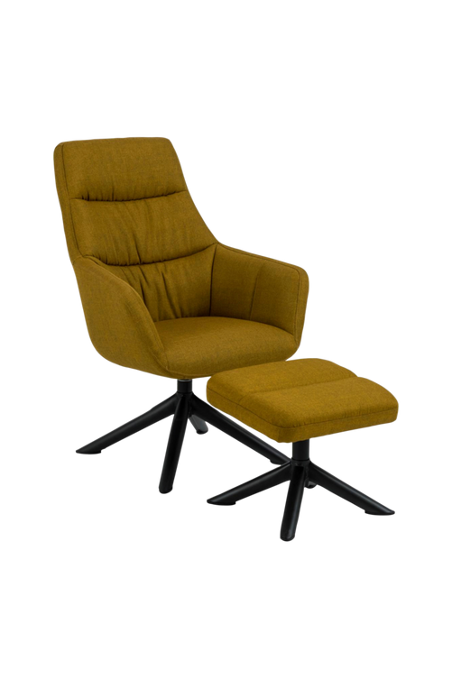 Se hit alla som älskar färg! Det är dags att göra plats för ett nytt tillskott i vardagsrummet. Denna loungestol är klädd i en varm, elegant curryfärg som verkligen gör att denna annars klassiska loungestol hamnar i blickfånget. Lägg märke till det veckade tyget på ryggstödet som ger stolen ett modernt uttryck. Den robusta stommen med fyra ben ger stabilitet. Mått; Fåtölj Höjd 100, djup 117, bredd 70 cm. Fotpall 41×45, höjd 41 cm.