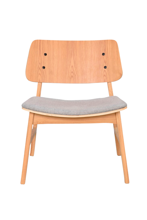 Nagano loungestol i massiv ek och med sits i ljusgrått tyg. En praktiskt, komfortabel och stabil stol med fina arbetade detaljer. Trevlig att ha som udda stol i hallen, sovrummet eller vardagsrummet.