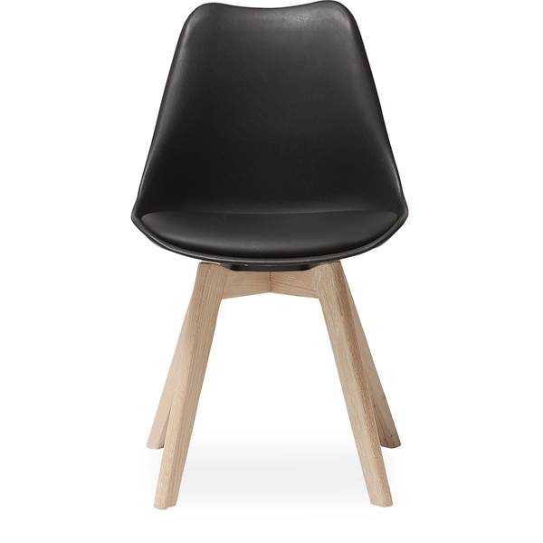 matstol, maxbelastning 120 kg och siddehøjde 44 cm. – Formstöpt svart plast, kuddar i konstläder och ben i vitoljad ek