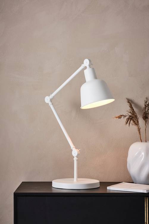 Modern bordslampa av metall. Ställbar i tre leder så ljuset kan riktas efter tycke och smak. Sladdlängd 1,5 m. Material: Metall. Storlek: Höjd 80 cm. Skärm: Höjd 32 cm, ø 22 cm. Sockel/lampa: 1 st E27, max 40 w glödlampa eller max 7 w lågenergilampa. Ljuskälla medföljer ej. Tips/råd: MADRID passar lika bra vid sängen som vid arbetsbordet.