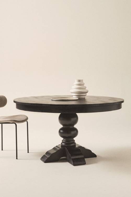 Runt matbord av massivt mangoträ. Ett handgjort, vackert matbord med rustik charm och mjukt formspråk. MADURAI är ett klassiskt pelarbord med kraftigt, snidat träben i mitten. Den runda formen bjuder naturligt in till samtal. Viss avvikelse kan förekomma eftersom möbeln är handgjord. Viss montering krävs. Monteringsanvisning medföljer. Material: Trä. Storlek: Höjd 75 cm, ø 140 cm. Höjd upp till bordskant: 66 cm. Beskrivning: Viss montering krävs. Skötselråd: Torkas av med lätt fuktad trasa. Tips/råd: Fyll hemmet med vänner och duka med porslin från Jotex som kommer till sin rätt på det rustika bordet.