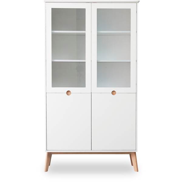 Vitrinskåp, 4 hyllor, 2×2 luckor och med ben, levereras omonterad. – Vitlackerad MDF, gasluckor och ben i massiv ek