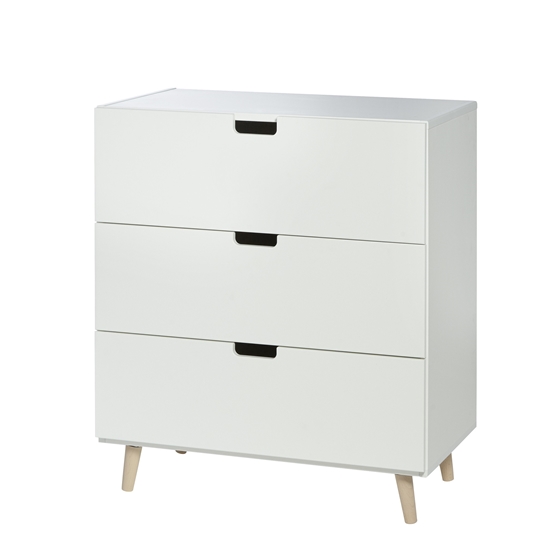 Den här snygga byrån är designad och tillverkad i Danmark utav Manis-h. Byrån har tre rymliga lådor. Lådorna har utslipade handtag som gör dem lätta att öppna och stänga – även för barnen. Byråns lådor är tillverkade i massivt trä för att vara så hållbara som möjligt. Dess ben är gjorda utav bokträ. Denna snygga möbel passar i alla rum som behöver extra förvaring.