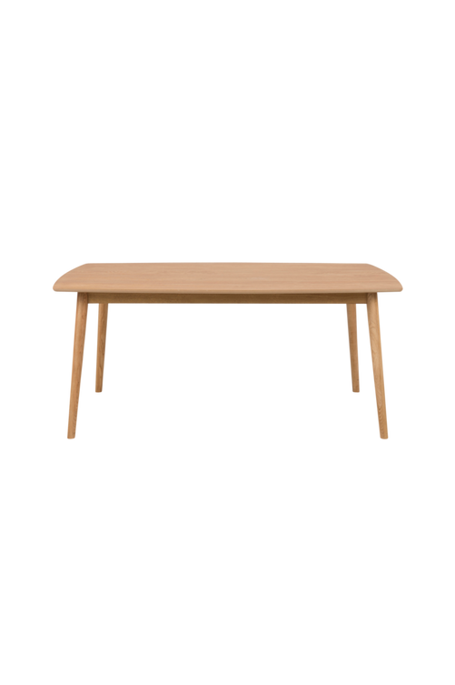 Matbord av ekfanérad skiva, massiva ek ben. 150×80, höjd 75.5 cm. Montera själv.