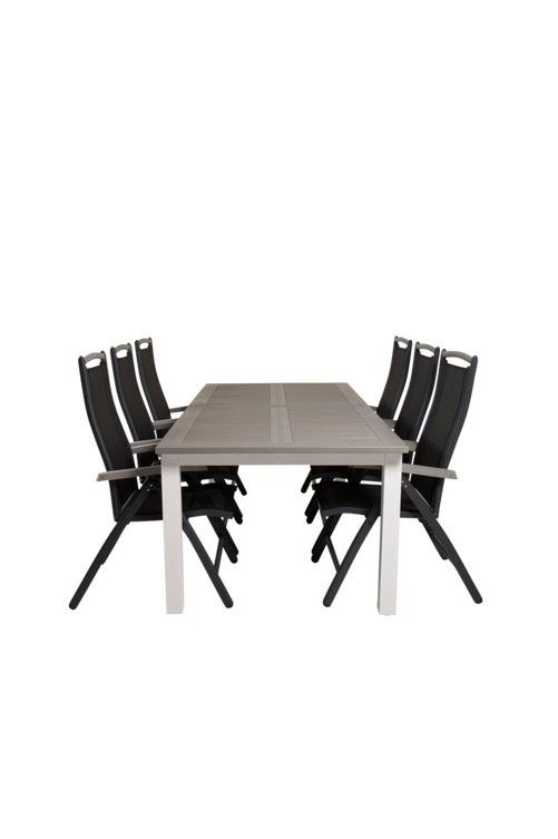 Athena matbord med en gråfärgad topp i aintwood och vita bordsben i aluminium. Bordets mått: Längd förlängningsbar mellan: 224 cm och 326 cm, Bredd: 100 cm, Höjd: 76 cm. Matchas med 6st fällbara Athena matstolar i svart textilene och svarta stolsben i aluminium samt detaljer i aintwood. Stolens mått: Totalhöjd: 108cm, Bredd: 46 cm, Djup: 48 cm, Sitthöjd: 44,5 cm. Bord och stol kräver enklare montering.