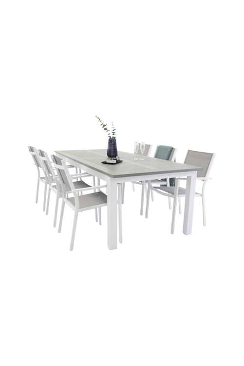 Athena matbord med en gråfärgad topp i aintwood och vita bordsben i aluminium. Bordets mått: Längd förlängningsbar mellan:: 224cm och 326cm, Bredd: 100cm, Höjd: 76cm. Matchas med 6st stapelbara Cassie matstolar i vit färg och stolsben i aluminium. Stolens mått: Totalhöjd: 88cm, Bredd: 50cm, Djup: 44cm, Sitthöjd: 43cm. Bord och stol kräver enklare montering.