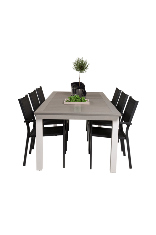 Athena matbord med en topp i aintwood och vita bordsben i aluminium. Bordets mått: Längd förlängningsbar mellan: 224cm och 326cm, Bredd: 100cm, Höjd: 76cm. Matchas med 6st stapelbara Cassie matstolar i textilene och stolsben i aluminium. Stolens mått: Totalhöjd: 88cm, Bredd: 50cm, Djup: 44cm, Sitthöjd: 43cm. Bord och stol kräver enklare montering.