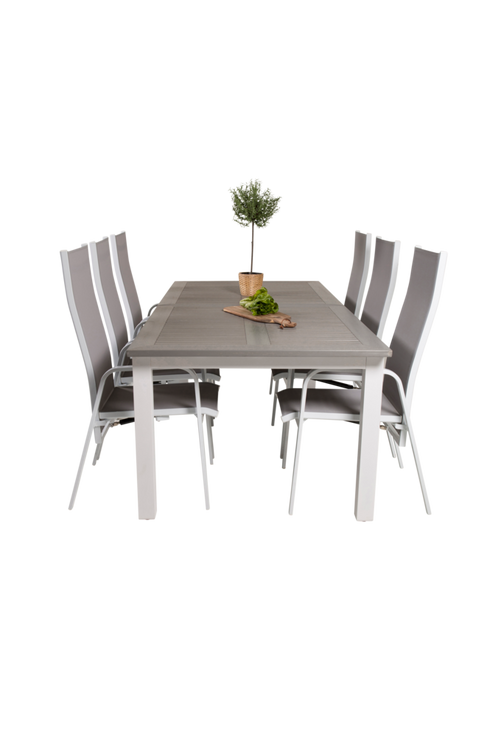 Athena matbord med en gråfärgad topp i aintwood och vita bordsben i aluminium. Bordets mått: Längd förlängningsbar mellan: 224cm och 326cm, Bredd: 100cm, Höjd: 76cm. Matchas med 6st stapelbara Cassie matstolar i grå textilene och vita stolsben i aluminium. Stolens mått: Totalhöjd: 95cm, Bredd: 44cm, Djup: 42cm, Sitthöjd: 47cm. Bord och stol kräver enklare montering.