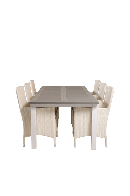 Athena matbord med en gråfärgad topp i aintwood och vita bordsben i aluminium. Bordets mått: Längd förlängningsbar mellan: 224cm och 326cm, Bredd: 100cm, Höjd: 76cm. Matchas med 6st Meja matstolar. Stolens mått: Totalhöjd: 92cm, Bredd: 48cm, Djup: 43cm, Sitthöjd: 48cm. Bord och stol kräver enklare montering.