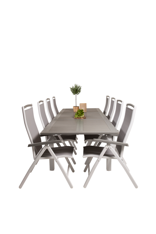 Athena matbord med en gråfärgad topp i aintwood och vita bordsben i aluminium. Bordets mått: Längd förlängningsbar mellan: 224cm och 326cm, Bredd: 100cm, Höjd: 76cm. Matchas med 8st fällbara Athena matstolar i textilene och stolsben i aluminium med detaljer i aintwood. Stolens mått: Totalhöjd: 109cm, Bredd: 46cm, Djup: 49cm, Sitthöjd: 44cm. Bord och stol kräver enklare montering.