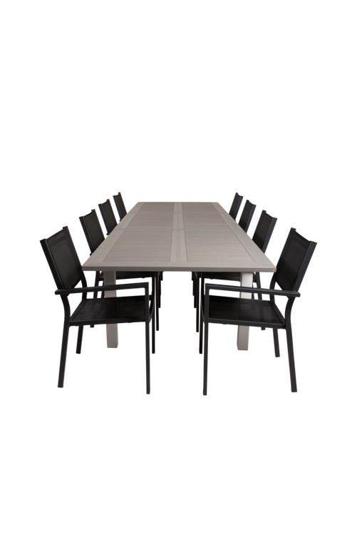 Athena matbord med en topp i aintwood och vita bordsben i aluminium. Bordets mått: Längd förlängningsbar mellan: 224cm och 326cm, Bredd: 100cm, Höjd: 76cm. Matchas med 8st stapelbara Cassie matstolar i textilene och stolsben i aluminium. Stolens mått: Totalhöjd: 88cm, Bredd: 50cm, Djup: 44cm, Sitthöjd: 43cm. Bord och stol kräver enklare montering.