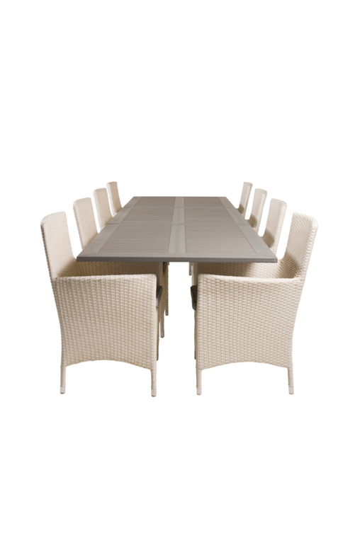 Athena matbord med en gråfärgad topp i aintwood och vita bordsben i aluminium. Bordets mått: Längd förlängningsbar mellan: 224cm och 326cm, Bredd: 100cm, Höjd: 76cm. Matchas med 8st Meja matstolar. Stolens mått: Totalhöjd: 92cm, Bredd: 48cm, Djup: 43cm, Sitthöjd: 48cm. Bord och stol kräver enklare montering.