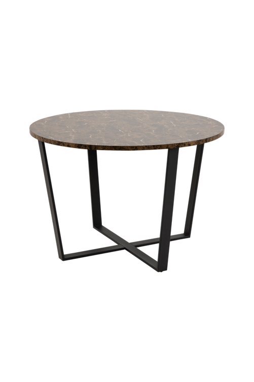 Tea matbord topp av melamine med marmorprint. Stomme av pulverlackad metall. Mått; Diameter 110 cm, höjd 75 cm. Montera själv.