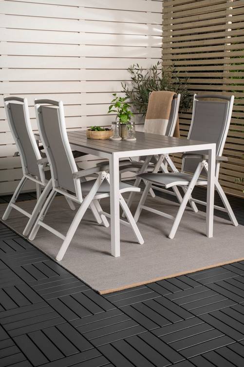 Bliss matbord i aintwood och vita bordsben i aluminium. Bordets mått: Längd: 150cm, Bredd: 90cm, Höjd: 74cm. Matchas med 4st fällbara Athena matstolar i textilene och stolsben i aluminium med detaljer i aintwood. Stolens mått: Totalhöjd: 109cm, Bredd: 46cm, Djup: 49cm, Sitthöjd: 44cm. Bord och stol kräver enklare montering.