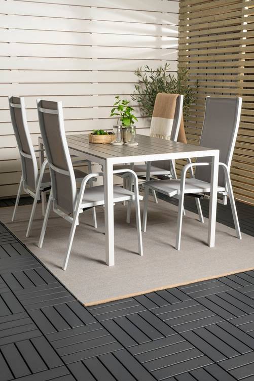 Bliss matbord i aintwood och vita bordsben i aluminium. Bordets mått: Längd: 150cm, Bredd: 90cm, Höjd: 74cm. Matchas med 4st stapelbara Cassie matstolar i textilene och stolsben i aluminium. Stolens mått: Totalhöjd: 95cm, Bredd: 44cm, Djup: 42cm, Sitthöjd: 47cm. Bord och stol kräver enklare montering.
