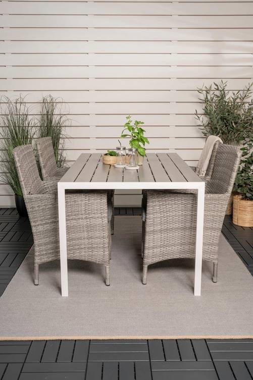 Bliss matbord i grå aintwood och vita bordsben i aluminium. Bordets mått: Längd: 150cm, Bredd: 90cm, Höjd: 74cm. Matchas med 4st Meja matstolar. Stolens mått: Totalhöjd: 92cm, Bredd: 48cm, Djup: 43cm, Sitthöjd: 48cm. Bord och stol kräver enklare montering.