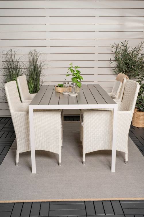 Bliss matbord i grå aintwood och vita bordsben i aluminium. Bordets mått: Längd: 150cm, Bredd: 90cm, Höjd: 74cm. Matchas med 4st Meja matstolar. Stolens mått: Totalhöjd: 92cm, Bredd: 48cm, Djup: 43cm, Sitthöjd: 48cm. Bord och stol kräver enklare montering.