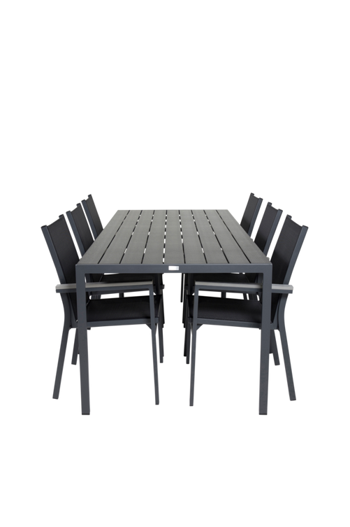 Bliss matbord med en svart topp i aintwood och svarta bordsben i aluminium. Bordets mått: Längd: 205cm, Bredd: 90cm, Höjd: 74cm. Matchas med 6st stapelbara Pascal matstolar i svart textilene och grå aintwood med svarta ben i aluminium. Stolens mått: Totalhöjd: 60cm, Bredd: 47cm, Djup: 42cm, Sitthöjd: 43,5cm. Bord och stol kräver enklare montering.