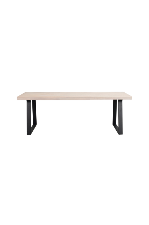Praktiskt matbord i klassisk design i fingerskarvad vitpigmenterad ek. Längd 220 cm, bredd 95 cm, höjd 75 cm. Bordet kan kompletteras med upp till två tilläggsskivor (ingår ej). Bordsskivan har slät finish och benen är u-formade i svart metall. Tänk på att! Oljebehandlade ytor ska behandlas med möbelolja innan den används och sedan regelbundet 2- 3 gånger per år, för att bibehålla motståndskraft mot fläckar och repor. Innan inoljning av möbeln behöver ytan rengöras för att få bort smuts och fett, en trärengöring avsedd för ändamålet bör användas.