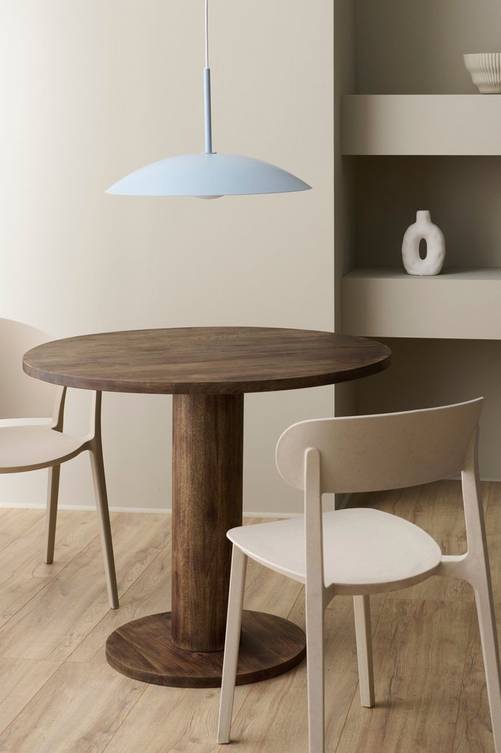 Lättplacerat matbord i mangoträ med stabiliserande kärna av metall. Enklare montering.