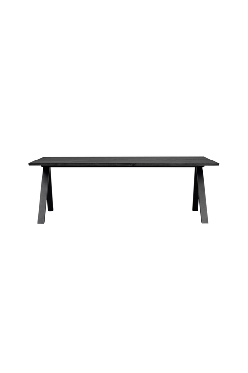 Carradale matbord med tvådelad massiv bordsskiva i ek och V-ben i svart pulverlackad metall. Bordsskivan kan kompletteras med 1 eller 2 tilläggsskivor à 50 cm vilket kan göra bordet upp till 320 cm långt, ingår ej.