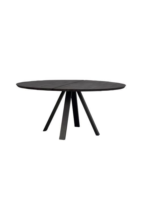 Carradale matbord med tvådelad massiv bordsskiva i ek och V-ben i svart pulverlackad metall.