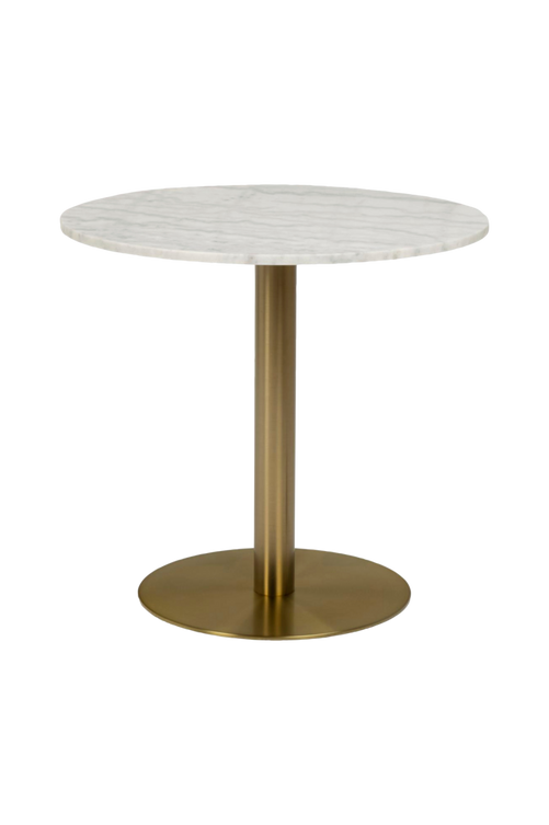 Ett generöst utrymme för middagar erbjuds av detta matbord med polerad vit marmorskiva. Med stöd av en rund metallbotten i borstad mässing passar matbordet alla moderna heminredningar.