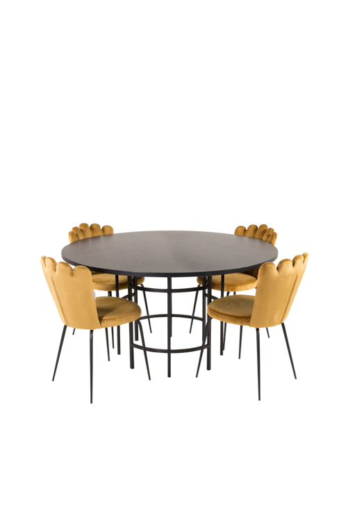 Copenhagen Furniture Fashion matbord med en rund topp i MDF samt fanér och bordsben i metall. Bordets mått: Diameter: 140 cm, Höjd: 74 cm. Med 4 stycken Limhamn Furniture Fashion stolar i sammet och stolsben i metall. Stolens mått: Totalhöjd: 82,5 cm, Bredd: 44,5 cm, Djup: 54 cm, Sitthöjd: 48 cm. Bord och stol kräver enklare montering.