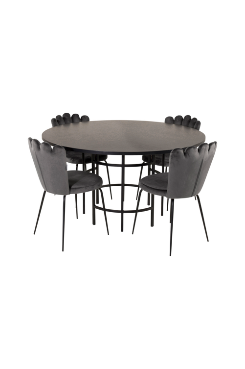 Copenhagen Furniture Fashion matbord med en rund topp i MDF samt fanér och bordsben i metall. Bordets mått: Diameter: 140 cm, Höjd: 74 cm. Med 4 stycken Limhamn Furniture Fashion stolar i sammet och stolsben i metall. Stolens mått: Totalhöjd: 82,5 cm, Bredd: 44,5 cm, Djup: 54 cm, Sitthöjd: 48 cm. Bord och stol kräver enklare montering.