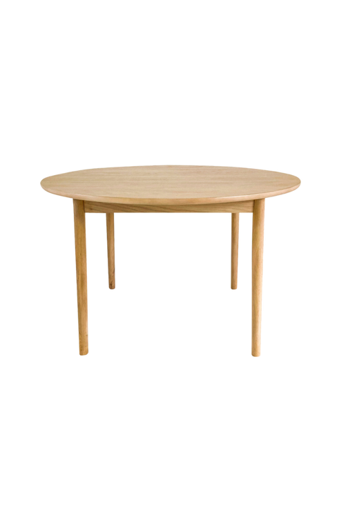 Runt matbord med skiva i ekfaner. Bordet är 120 cm i diameter.
