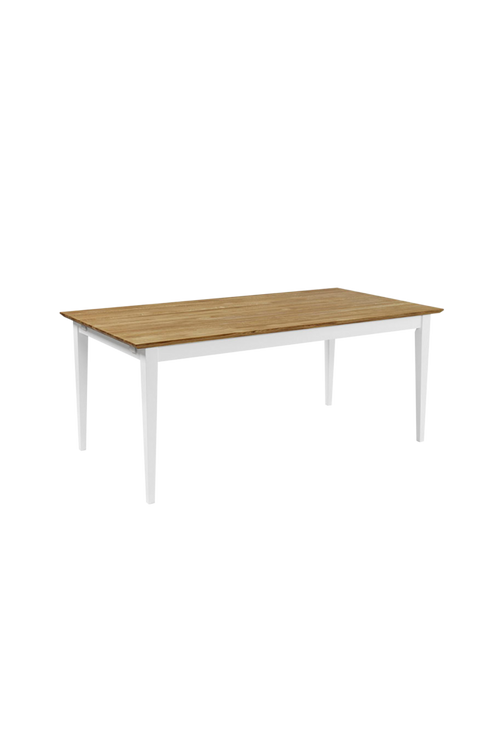 Matbord med fasad kant på toppskiva och konade ben. Längd 140 cm. Bredd 95 cm. Höjd 75 cm. Vikt 29 kg.