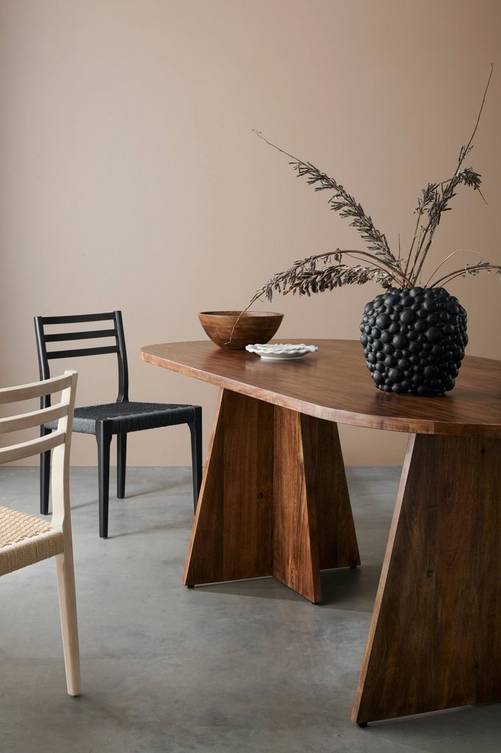 Matbord med modern, oval form. Av massivt mangoträ med vaxad yta på skivan. Mått: Längd 200 cm, bredd 90 cm, höjd 76 cm. Bredd mellan benen 110 cm. Levereras omonterat.