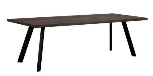 Stort och härligt matbord i massiv ek. Tvådelad bordsskiva i stilren design. Ben i pulverlackad svart metall som är justerbara i sidled. Längd 240 cm, bredd 100 cm och höjd 75 cm. Montera själv.