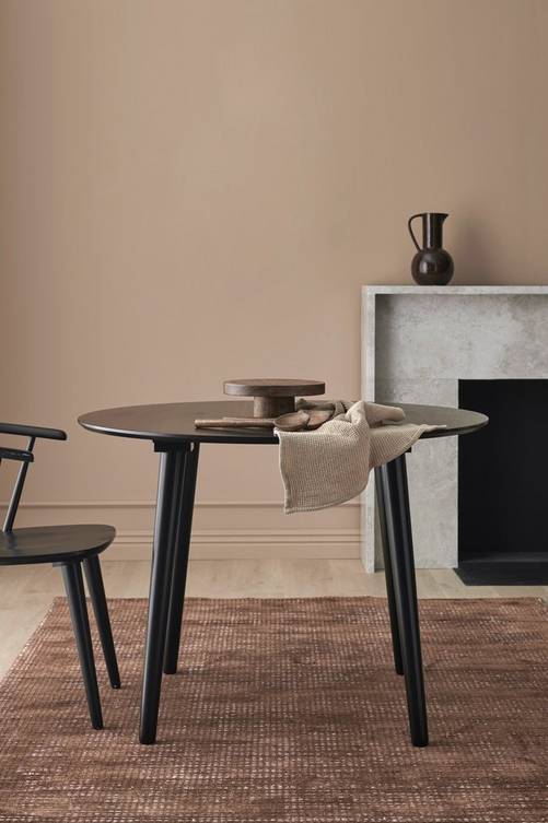 Matbord med skiva av askfanérad MDF och ben av massivt gummiträ. Ytan är betsad och lackad. Bordsskivans tjocklek ca 2 cm. Enklare montering.