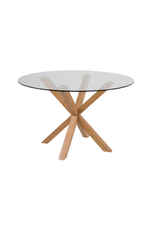 Matbord Klara, bordsplatta av 10 mm klarglas. Ben av metallklädd med Ek folie. Mått; 119 x 119 cm, höjd 75,5 cm. Levereras omonterad.