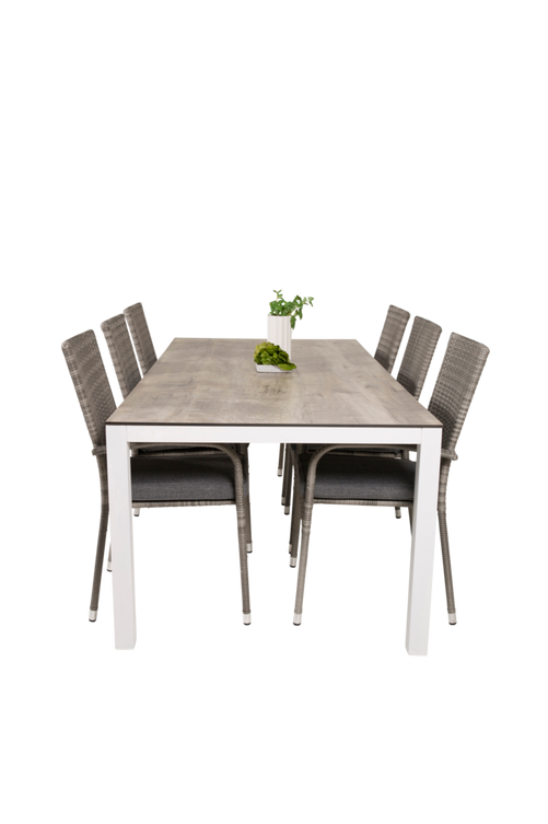 Lambi matbord i grå HPL och vita bordsben i aluminium. Bordets mått: Längd: 205cm, Bredd: 100cm, Höjd: 75cm. Kräver enklare montering.