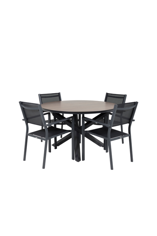 Madrid matbord med en brun topp i HPL och svarta bordsben i aluminium. Bordets mått: Diameter: 140cm, Höjd: 73cm. Matchas med 4st stapelbara Cassie matstolar i svart textilene och svarta stolsben i aluminium. Stolens mått: Totalhöjd: 88cm, Bredd: 50cm, Djup: 44cm, Sitthöjd: 43cm. Bord och stol kräver enklare montering.