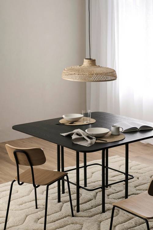 Matbord av askfanérad MDF med ben i metall. Frihöjd under möbel 25 cm. Enklare montering.