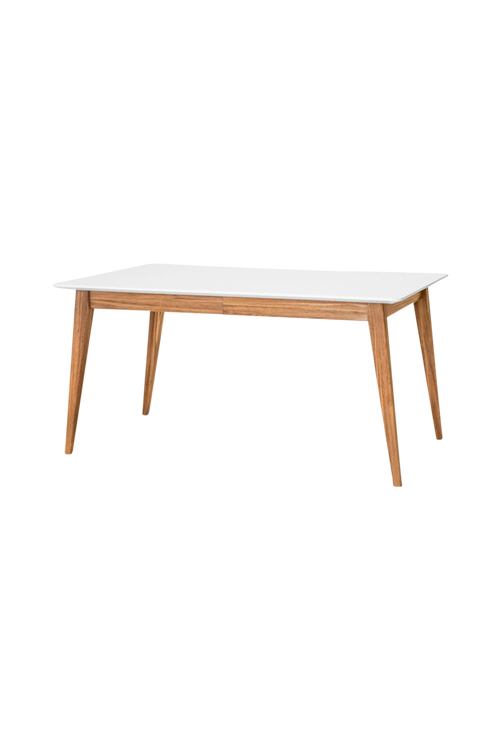 Matbord med vit skiva och underrede i oljad ek med butterflyilägg på 50 cm. Längd 150 cm. Bredd 95 cm. Höjd 75 cm. Vikt 65 kg.