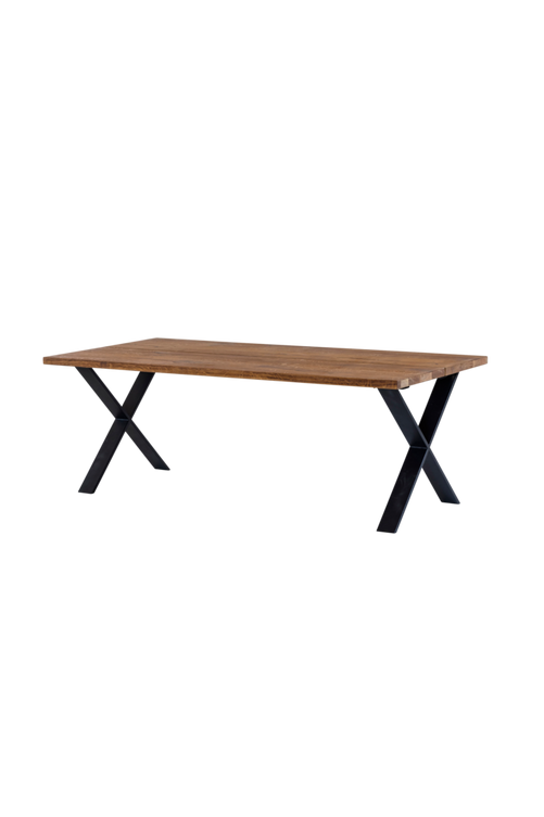 Matbord 160×100 cm oljad vildek med underrede X-ben i svart metall. Längd 160 cm. Bredd 100 cm. Höjd 75 cm. Vikt 70 kg.