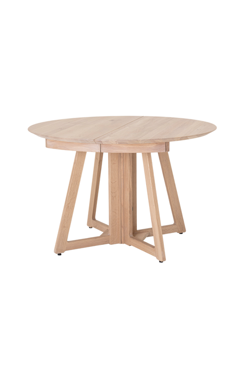 Matbord av massiv ek. Två iläggsskivor ingår. Diameter med 1 iläggsskiva 168 cm. Diameter med 2 iläggsskivor 218 cm. Levereras omonterad.